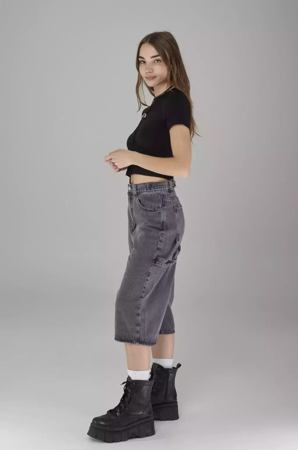 -Bermuda largo jort, tiro medio con charretillas regulables para tiro alto, estilo carpintero.